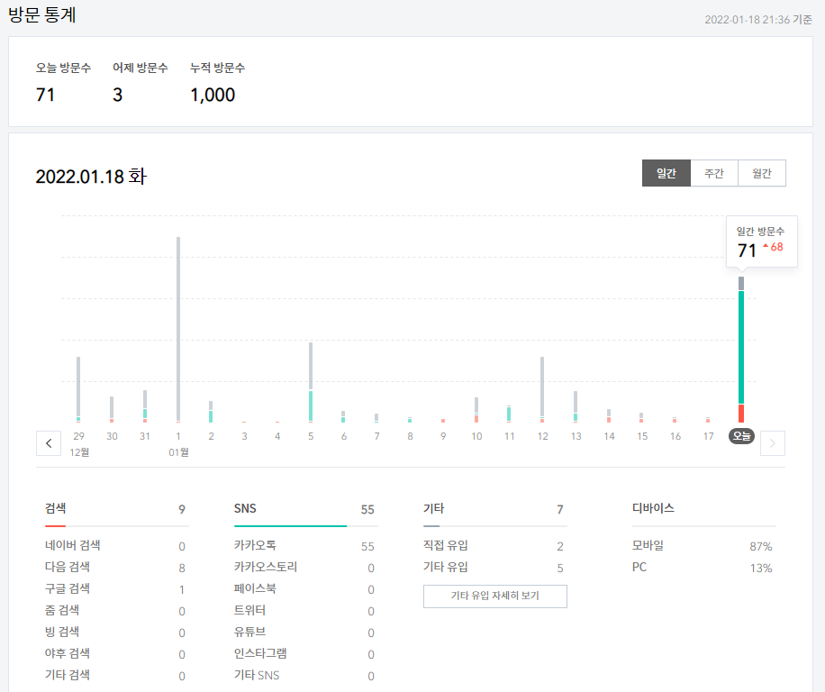 블로그를 시작한 지 이제 겨우 30일이 조금 넘어가는데 누적 방문자 수 1000명 달성에 너무 기쁘네요.